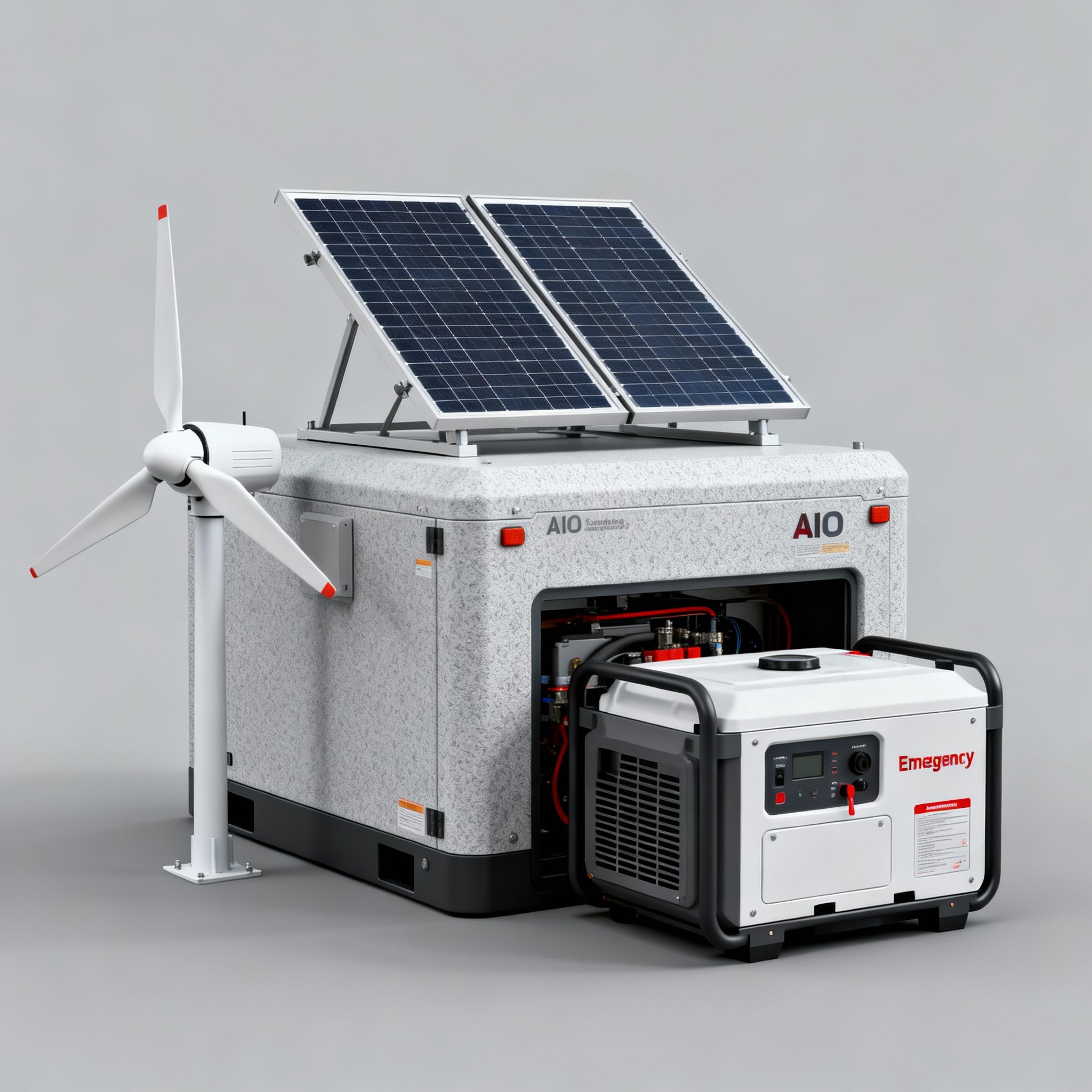 The AIO series represents our most advanced hybrid technology, integrating wind turbines, solar panels, diesel generators, and battery storage in one weatherproof container. Available in 10kVA, 20kVA, and 30kVA configurations, these systems provide 24/7 reliable power with minimal fuel consumption.